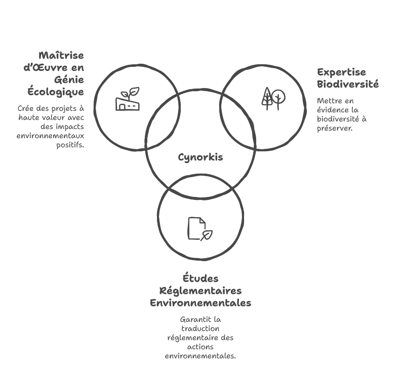 À ses débuts, CYNORKIS réalisait principalement des expertises écologiques. Avec l’expérience, une évidence s’est imposée : pour réduire réellement les impacts sur l’environnement, l’écologie ne peut pas être cantonnée au diagnostic. Elle doit être intégrée à chaque étape du projet, de la conception jusqu’à la mise en œuvre.